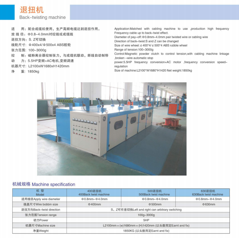 Back-twisting machine Application: Match,Epd wlth abling mchine to use ,production high frequency Frequency cable up to back-twist effect. Diameter of pay-off: 〇0.8mm-4.0mm pair twisted wire or cabling wire Direction of back_twist1:S and Z can be changed Size of wire wheel: c400·4/c500·4 ABS rubble wheel Range of tension:100-3000g Control;Magnetic powder clutch to control tension.with cabling machlne linkage ,broken-wire automatic stop power15.5HP frequency conversion+AC motor .frequency conversion speed-regulation Size of machine:L2100'W1680'H1420 Net weight:1850kg